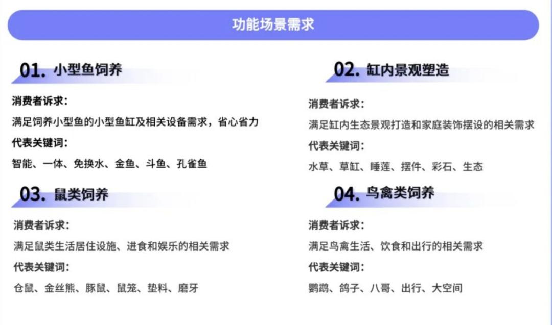 站在用户的需求角度而言,《2023水族小宠场景趋势白皮书》中指出,消费者在水族小宠相关货品的选择上以养鱼设备、水族景观装饰、仓鼠和鸟禽饲养类产品为主。其核心诉求,是围绕“养鱼省心省力/水族景观装饰/提升仓鼠、鸟禽生活品质”几个核心方向展开。