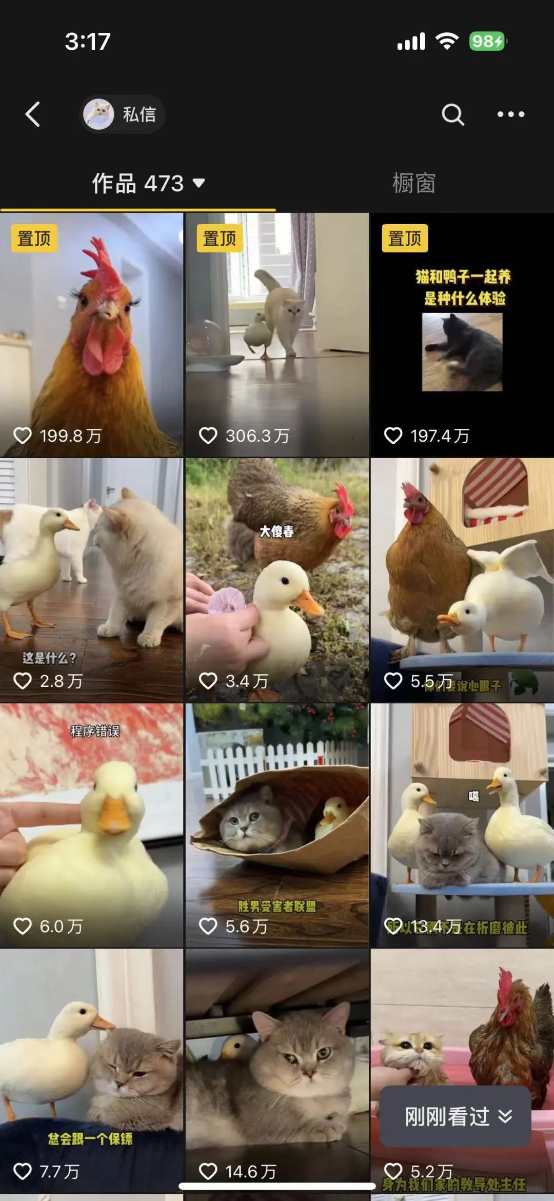 在她的抖音平台,分享着鸭子与猫与鸡其乐融融的日常,最高一条视频点赞量超300w+,其目前也已经积累了超280万粉丝。