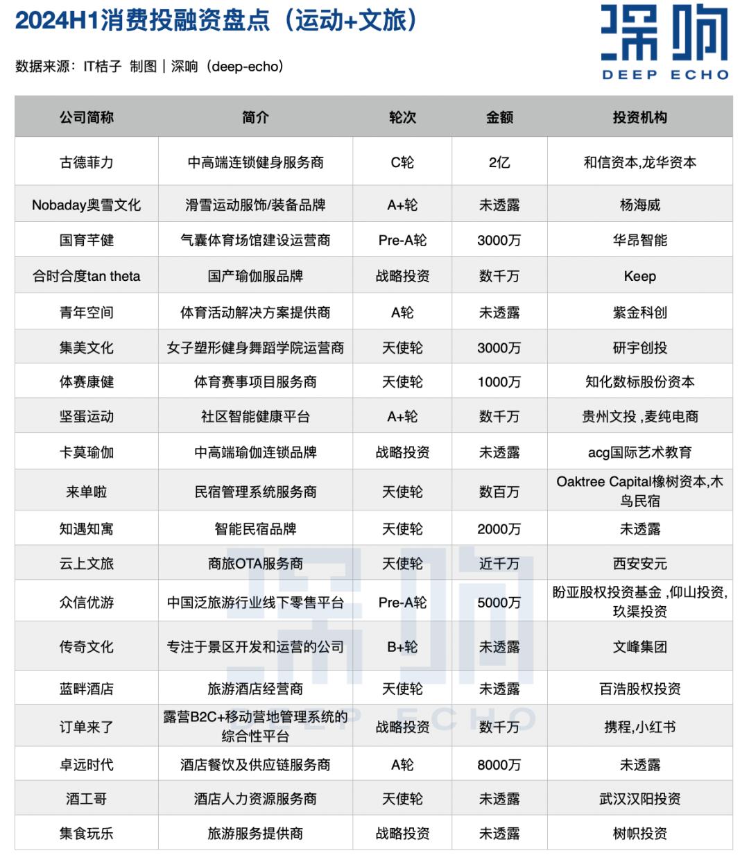运动健康方面,中高端连锁健身服务商“古德菲力”上半年完成近2亿元C轮融资;社区智能健康平台“坚蛋运动”完成了由贵州文投领投、麦纯电商跟投的数千万元A+轮融资;女子塑形健身舞蹈学院运营商“集美文化”完成了天使轮融资。文旅方面,酒店/民宿经营商(如“知遇知寓”、“蓝畔酒店”)、民宿管理系统服务商(如“来单啦”)、旅游服务提供商(如“集食玩乐”)均有融资动作。