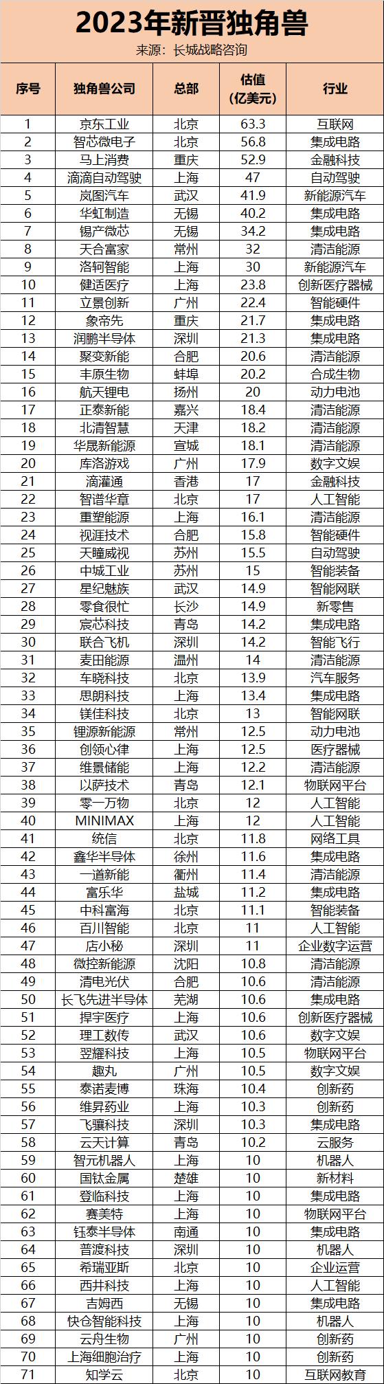榜单显示,2023年中国独角兽企业共有375家,总估值约为1.2万亿美元,新晋独角兽企业达71家。
