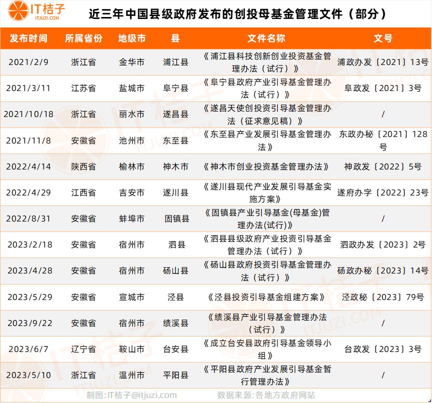 根据IT桔子观察,近几年以来,一些走在前面的县级政府已经出台了母基金/产业引导基金的管理办法,包括江苏省阜宁县,浙江省的遂昌县、浦江县,安徽省的固镇县、绩溪县、砀山县、泗县,陕西省榆林市神木市(县级市)等。