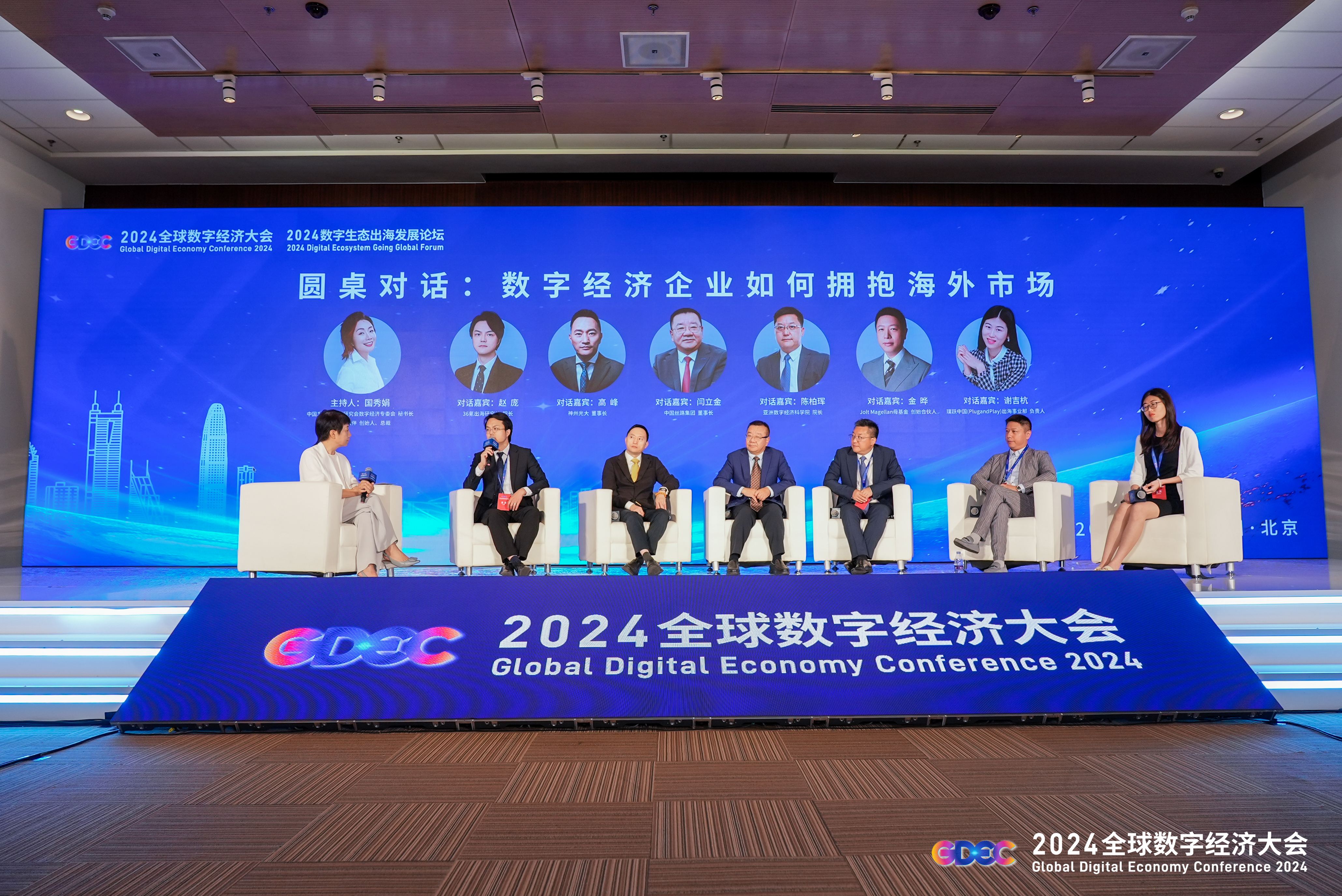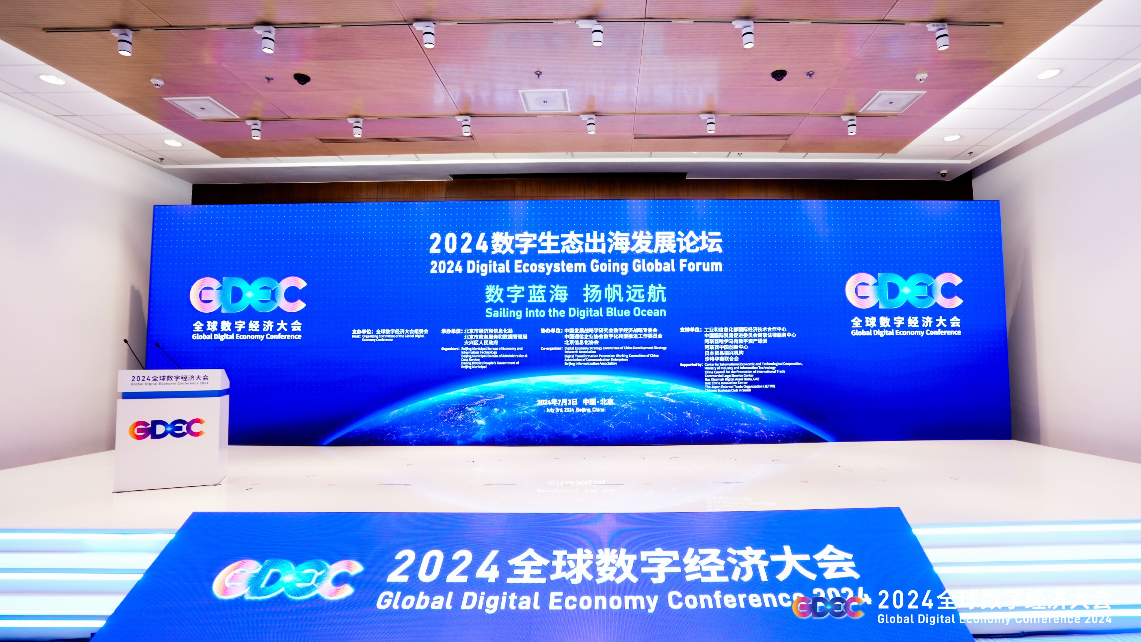“2024数字生态出海发展论坛”是2024全球数字经济大会”重要专题论坛之一,本次论坛围绕“数字蓝海,扬帆远航”主题,汇聚全球智慧和国内数字生态出海领域“政产学研资用”各方力量,共绘数字生态出海新蓝图。国家数据局、工业和信息化部、中国国际贸易促进委员会、北京市经济和信息化局、北京市政务服务和数据管理局、大兴区人民政府等政府领导,阿联酋、日本、沙特等多个国家的驻华使节和机构代表,经济领域学术大咖和产业精英等300余位国际国内重要嘉宾现场参会。