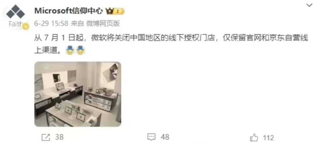 “7月1日起,微软将关闭中国地区的线下授权门店,仅保留官网和京东自营线上渠道。”
