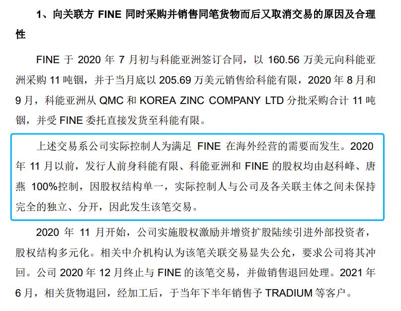 他们之间的相关交易是,2020年7月初,FINE先花160.56万美元向科能亚洲采购11吨铟,再于当月底以205.69万美元销售给科能有限。2020年8月和9月,科能亚洲从QMC和KOREA ZINC COMPANY LTD分批采购合计11吨铟,并受FINE委托直接发货至科能有限。
