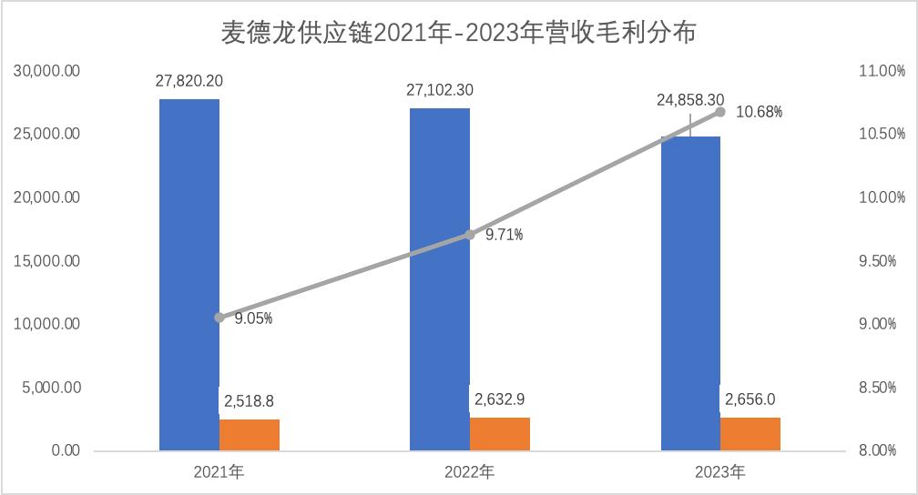 但整体毛利不降反升,分别为25.2亿元、26.3亿元及26.6亿元,毛利率也从2021年的9.05%上涨到2023年的10.68%。