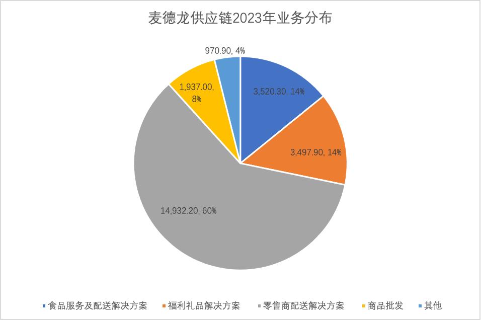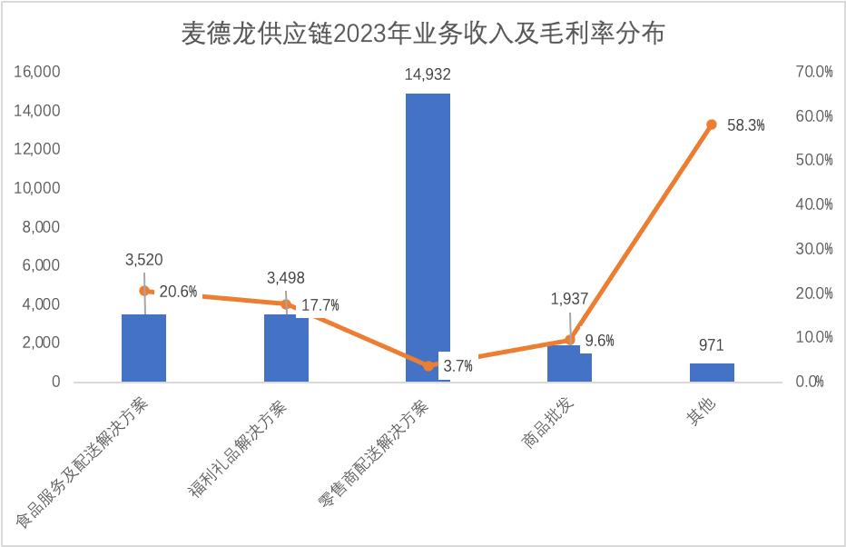 以2023年营收数据为例,零售商配送解决方案占整体营收占比过高,其相应营收接近150亿元,占整体营收达60%的比重;食品服务及配送解决方案和福利礼品解决方案营收均在35亿元左右的规模,合计占比为28%;商品批发部分营收为19亿元,占比为8%。