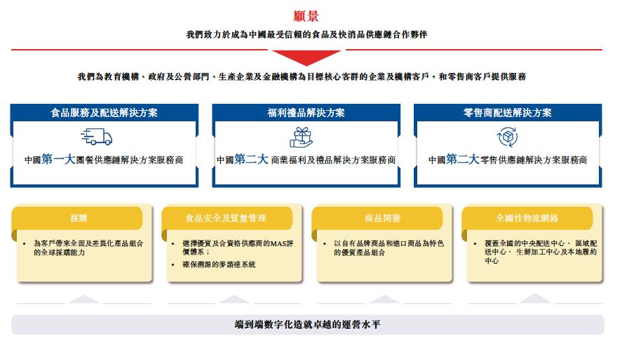 据其招股书介绍,麦德龙供应链是“中国首屈一指的食品快消供应链解决方案服务商,为广泛的企业、政府及机构客户以及零售商提供安全优质商品及高效便利的解决方案”。