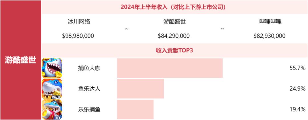 游酷盛世旗下以捕鱼游戏为主,在架的3款捕鱼游戏《捕鱼大咖》《鱼乐达人》《乐乐捕鱼》今年上半年均排在国内iOS畅销榜TOP100。其中《鱼乐达人》是从去年8月开始发力的新品,今年上半年营收占比接近25%。