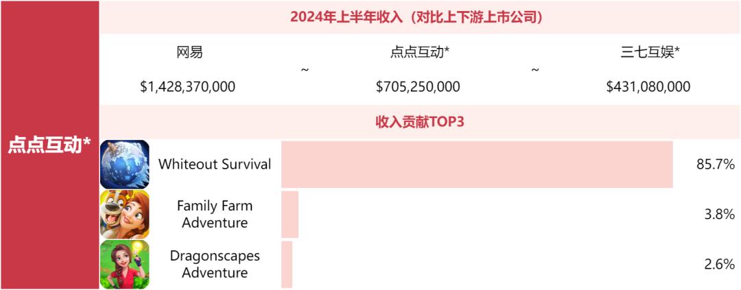 点点互动在模拟经营、角色扮演、SLG三大品类上都有沉淀,去年凭借着冰雪末日题材的放置经营《Frozen City》和SLG《Whiteout Survival》更是实现了同比超过50%的收入增长。《Whiteout Survival》在上半年贡献了超过80%的收入。另外在国内的微信小游戏版本《无尽冬日》在4月份上线,迅速登上在畅销榜TOP5并保持至今。