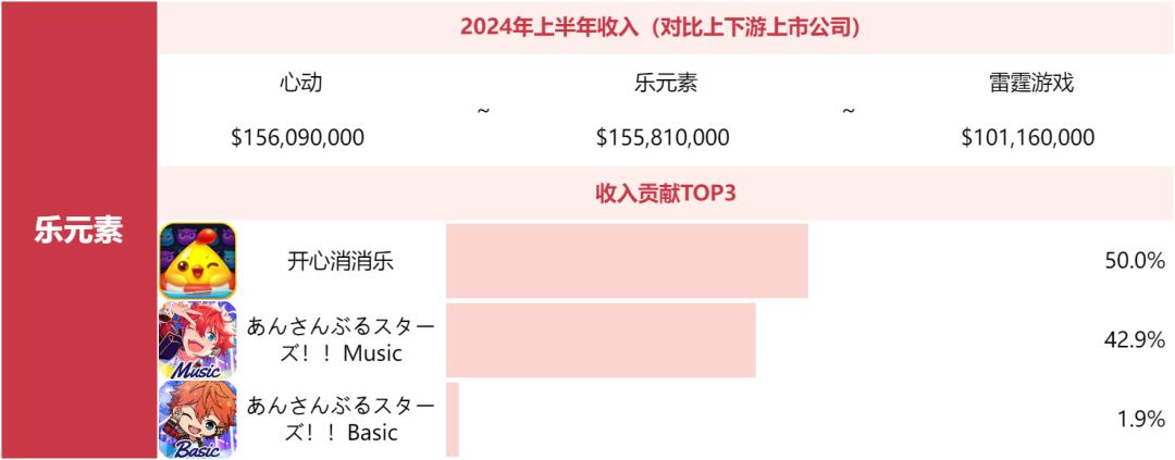 乐元素的业务覆盖到游戏、动漫、衍生品、虚拟偶像等各项娱乐业务。旗下主要产品《开心消消乐》至今依然是国内收入最好的三消游戏,上半年基本在国内iOS畅销榜10~30名之间徘徊,贡献了一半的收入来源。《偶像梦幻祭!!Music(あんさんぶるスターズ!!Music)》有九成收入都来自日本市场,自2020年上线至今维持稳定运营。