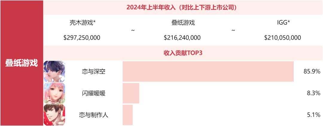 叠纸游戏在女性向市场有着未曾被超越的统治力。今年的新作女性向动作游戏《恋与深空》上线之后基本稳定在国内iOS畅销榜TOP60,每半个月能进入到前5。《恋与深空》在上半年也创造了超过85%的收入,而且国内市场是其最主要的收入来源。