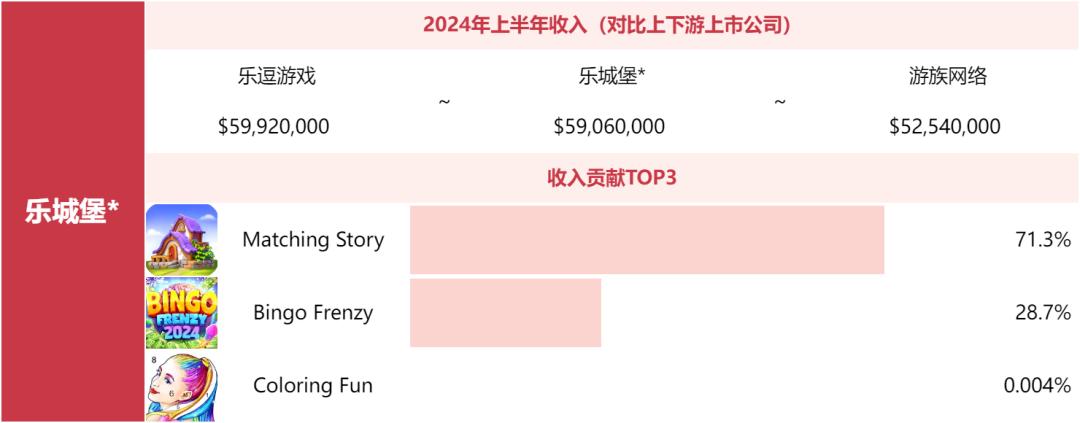 乐城堡专注于休闲游戏出海,早期主要尝试字谜等休闲游戏,在很长时间里都比较低调。今年在成立10年后靠一款三消+合成玩法的《Matching Story》成为黑马。《Matching Story》今年开始起量,目前排在美国iOS畅销榜150名左右,在上半年为公司创造了超过70%的收入。在此之前乐城堡有大部分收入来自于宾果游戏《Bingo Frenzy》。
