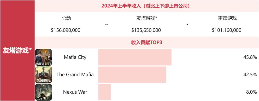 旗下两款黑帮题材SLG《Mafia City》和《The Grand Mafia》撑起了上半年将近90%的收入,在稳定运营的同时也在缓慢下滑的过程中。SLG新作《Nexus War》在去年上线之后没有特别亮眼的表现,但仍贡献了8%的收入。