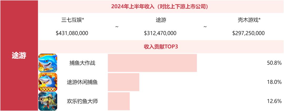 途游主要研运休闲捕鱼游戏。过去尝试过卡牌等其他品类,但是都没做出特别亮眼的成绩。捕鱼游戏则表现稳定甚至有所翻红。《捕鱼大作战》依然稳居国内iOS畅销榜TOP20,今年上半年贡献了过半的手游收入,另一款《途游休闲捕鱼》则基本排在国内iOS畅销榜TOP40。