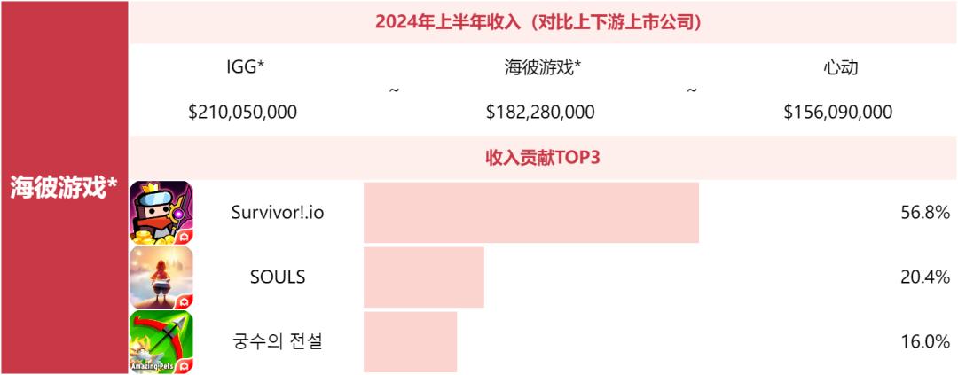 海彼网络当前的营收主力还是《弹壳特攻队(Survivor!.io)》,上半年贡献了56.8%的收入。去年年底《弹壳特攻队》止住了收入下滑的趋势,并稳定在国内iOS畅销榜TOP100。而且游戏在海外市场更为强势,美国是其最主要的海外市场,上半年为iOS版本提供了30%的收入。