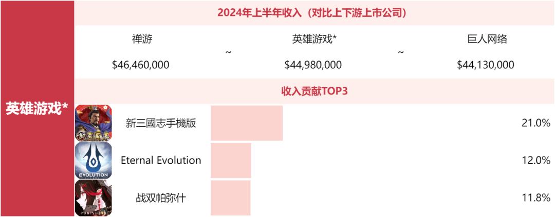 英雄游戏的海内外发行流水收入比较均衡。上半年流水最高的是在日本市场代理发行的《新三國志》,提供了21%收入,这款游戏长期在日本iOS畅销榜50~200名之间徘徊。发行的自研产品《Eternal Evolution》和代理产品《战双帕弥什》也分别提供了12%左右的收入。