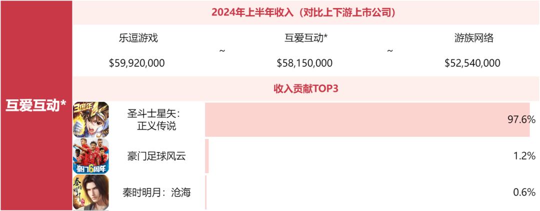 近年来互爱互动实现了出海业务的突破,主要靠的是IP改编思路。代表作品《圣斗士星矢:正义传说》在上半年的收入占比达到97.6%。这款游戏的主要出海收入来源于日本市场,其最高排在日本iOS畅销榜第3名。现在排名逐渐下滑,但仍保持在TOP100。