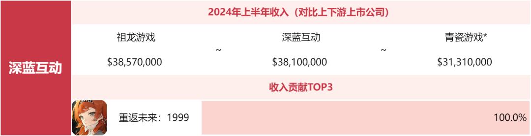 深蓝互动是一家专注二次元领域的初创公司,目前仅推出一款二次元游戏《重返未来:1999》。《重返未来:1999》在国内iOS畅销榜基本稳定在TOP150,且频繁闯入TOP15。海外市场的日语和英语版本也由深蓝互动自主发行,流水收入占比20%左右。