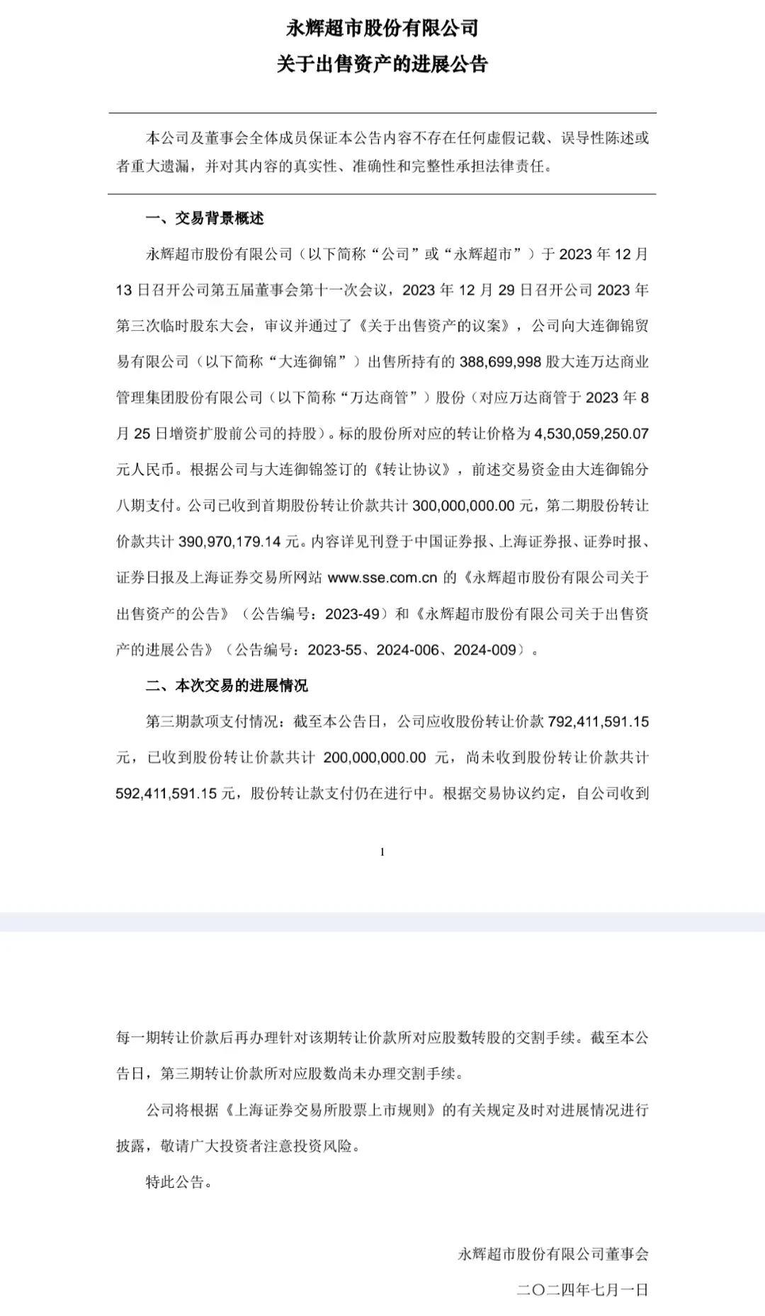 遗憾的是账算得虽好,钱却难以到账。买家孙喜双一再不能按时支付。按照约定,股权转让款分八期支付。其中,第一期3亿元于2023年12月29日按期支付。第二期3.91亿元出现了逾期情况。根据公告,第三期7.92亿元款项的付款时间为6月30日,目前永辉超市尚有5.92亿元未如期收到。