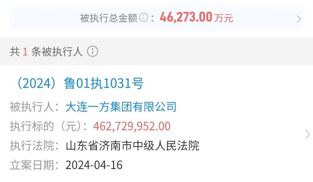 天眼查显示,2023年9月至今年3月,大连一方频繁将其持有的企业股权质押,高达11次。今年4月份,一方集团还新增了一条被执行人信息,执行标的金额高达4.63亿元。