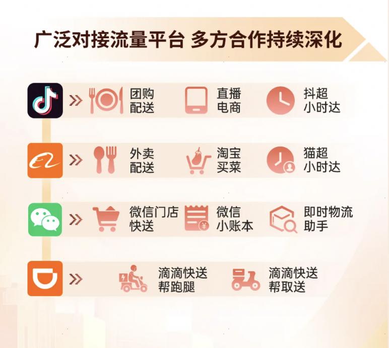 在内地,众多国内商业品牌和平台也与第三方即时配送平台“顺丰同城”达成了合作,如美团外卖与顺丰同城达成合作,共同打造即时配送行业生态。
