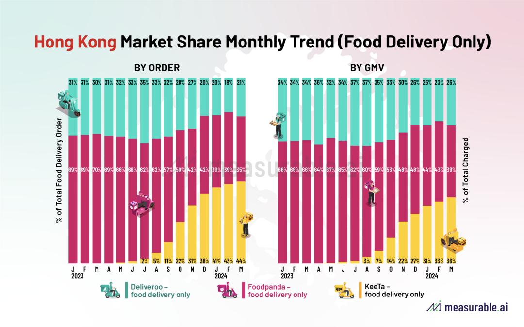 美团旗下KeeTa也在香港获得了更多增量空间。2023年5月,美团正式在香港成立外卖平台KeeTa,迈出出海第一步。不到一年,据第三方市场调研机构Measurable AI统计的2024年3月外卖订单量,KeeTa占香港食品外卖总订单量约44%,成为香港第一大外卖平台。