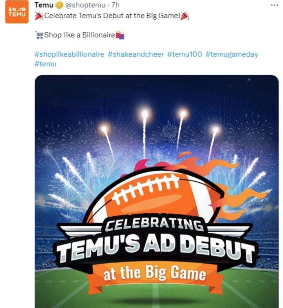 Temu在海外真正的爆发,是因为其于去年2月在“美国春晚”(超级碗比赛)期间,斥资千万美元投放了2条30秒广告,一共轮播了6次,突出平台低价优势,将“Shop like a Billionaire (像亿万富翁一样购物) ”的广告语一炮打响。