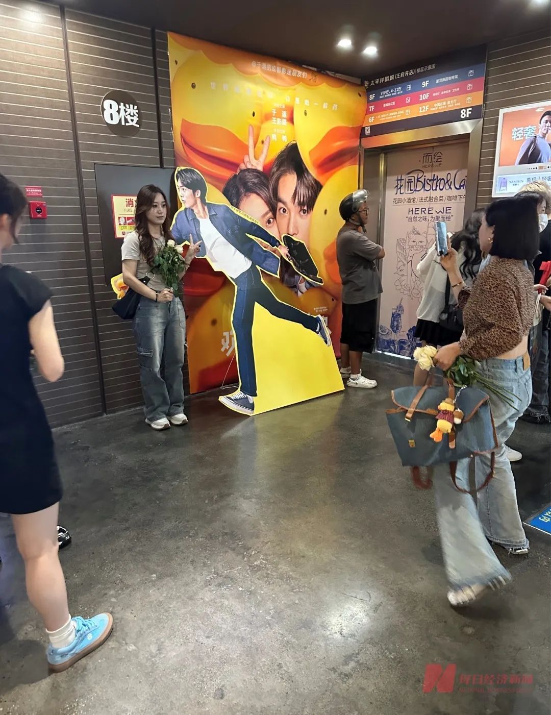 7月4日13时30分,观众陆续从成都太平洋影城(王府井店)的影厅走出,与影城内摆放的于适的物料合影留念。