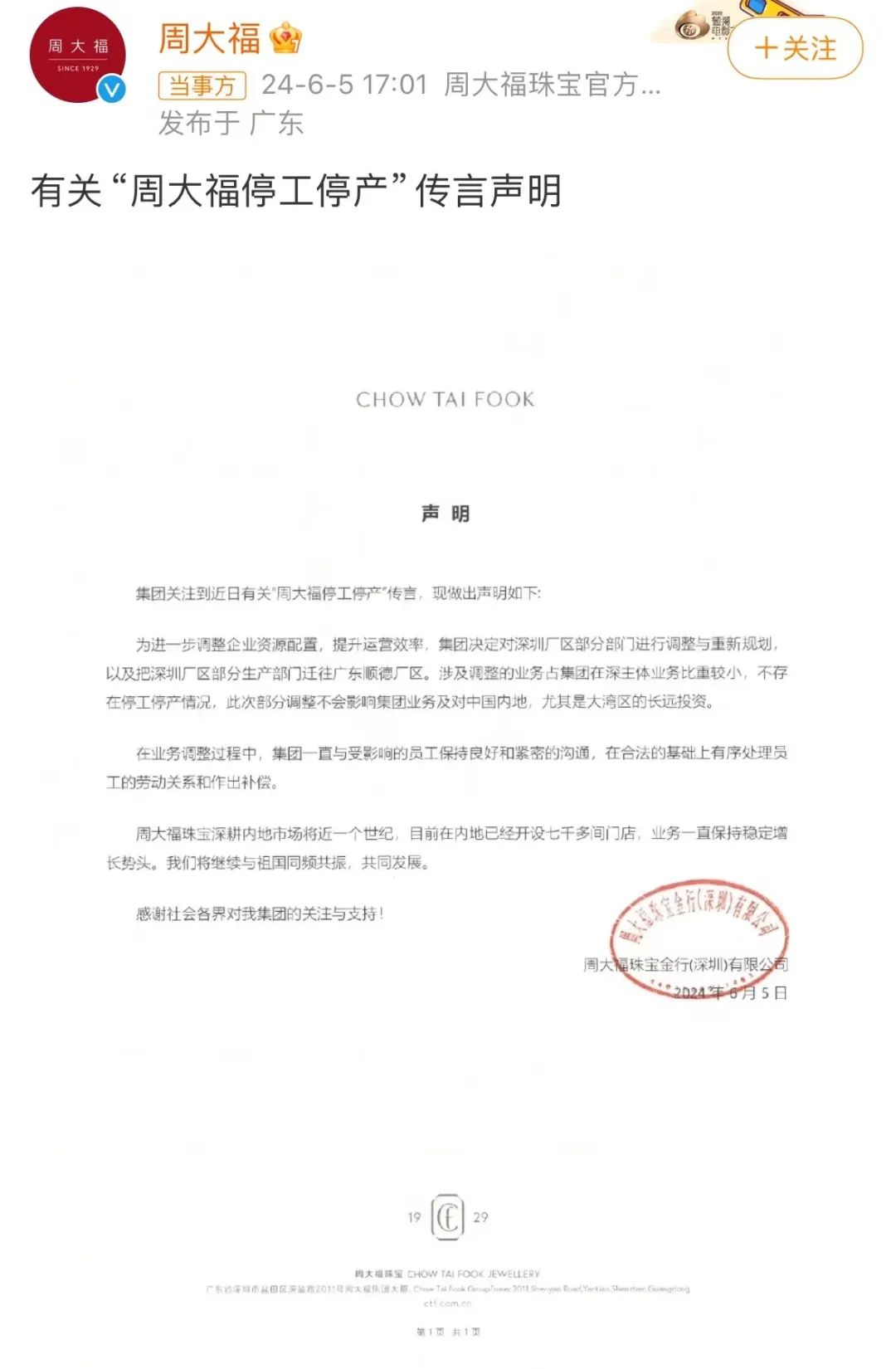 周大福不得不出面辟谣,称“此次关停只是把深圳厂区部分生产部门迁往广东顺德厂区”。