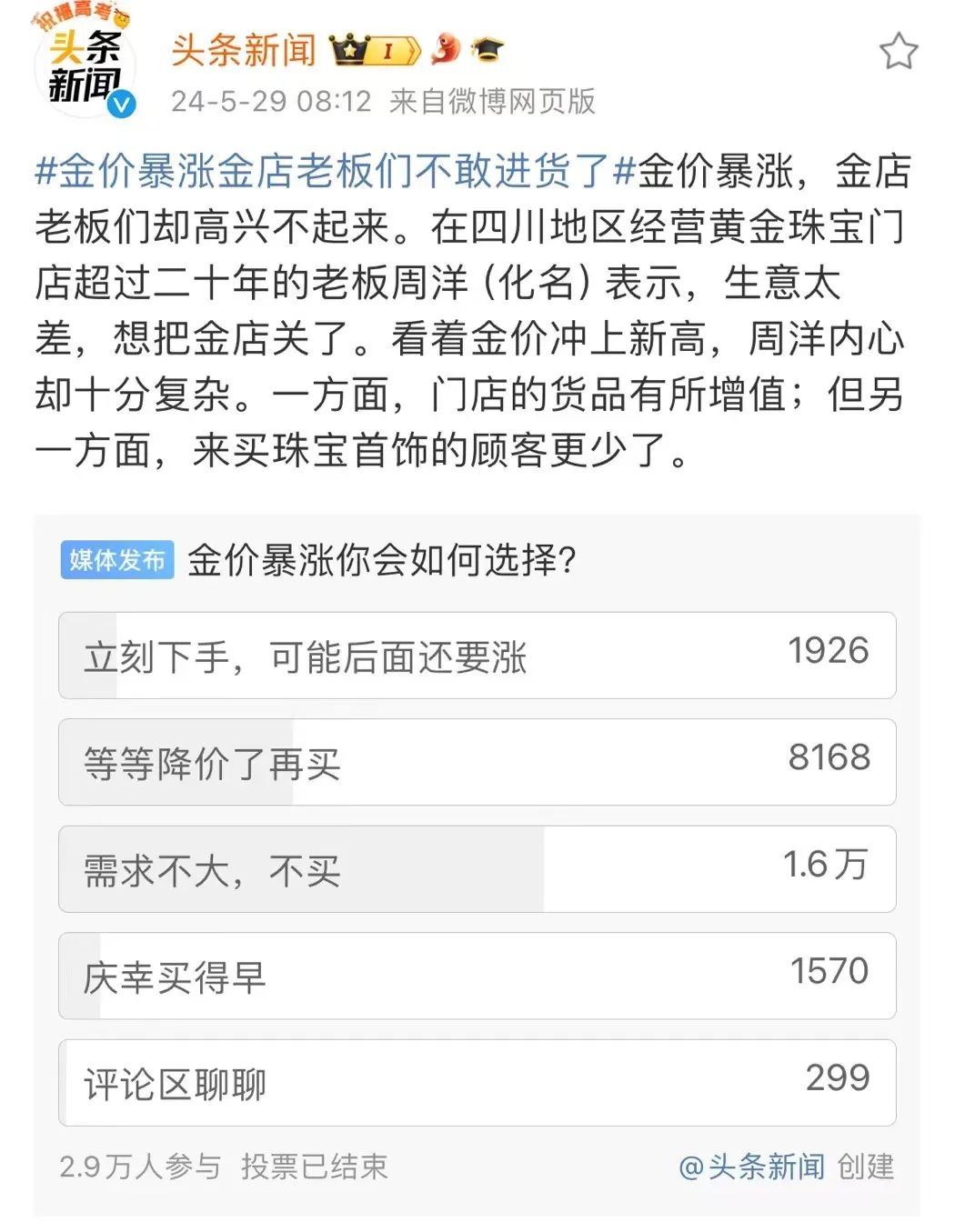 头条新闻在5月29日发布的一项名为“金价暴涨你会如何选择”的调查,共计2.3万人参与投票。