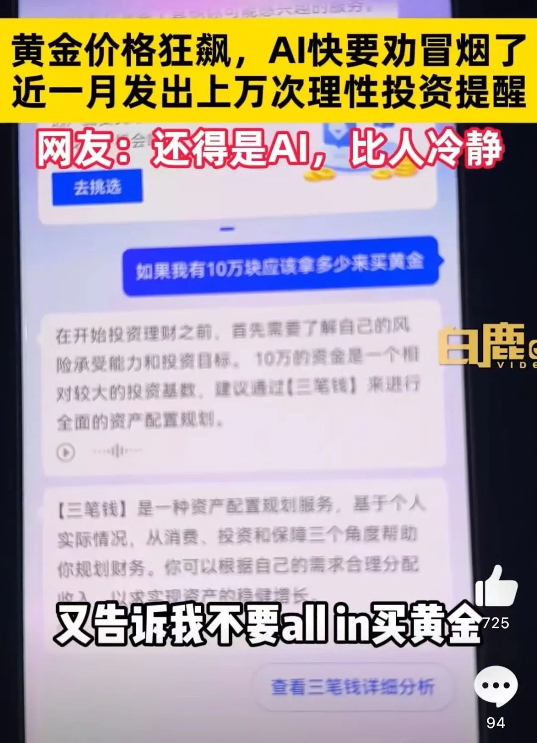 “AI一个月发出上万次理性投资黄金的提醒”也上了热搜。