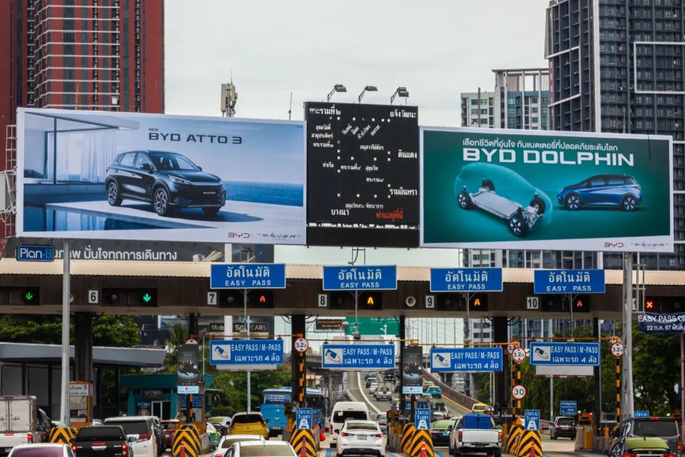 从泰国素万那普机场沿高速到曼谷城区,一路上,比亚迪、长城汽车、埃安等中国汽车厂商的巨幅广告牌不定期引入眼帘。