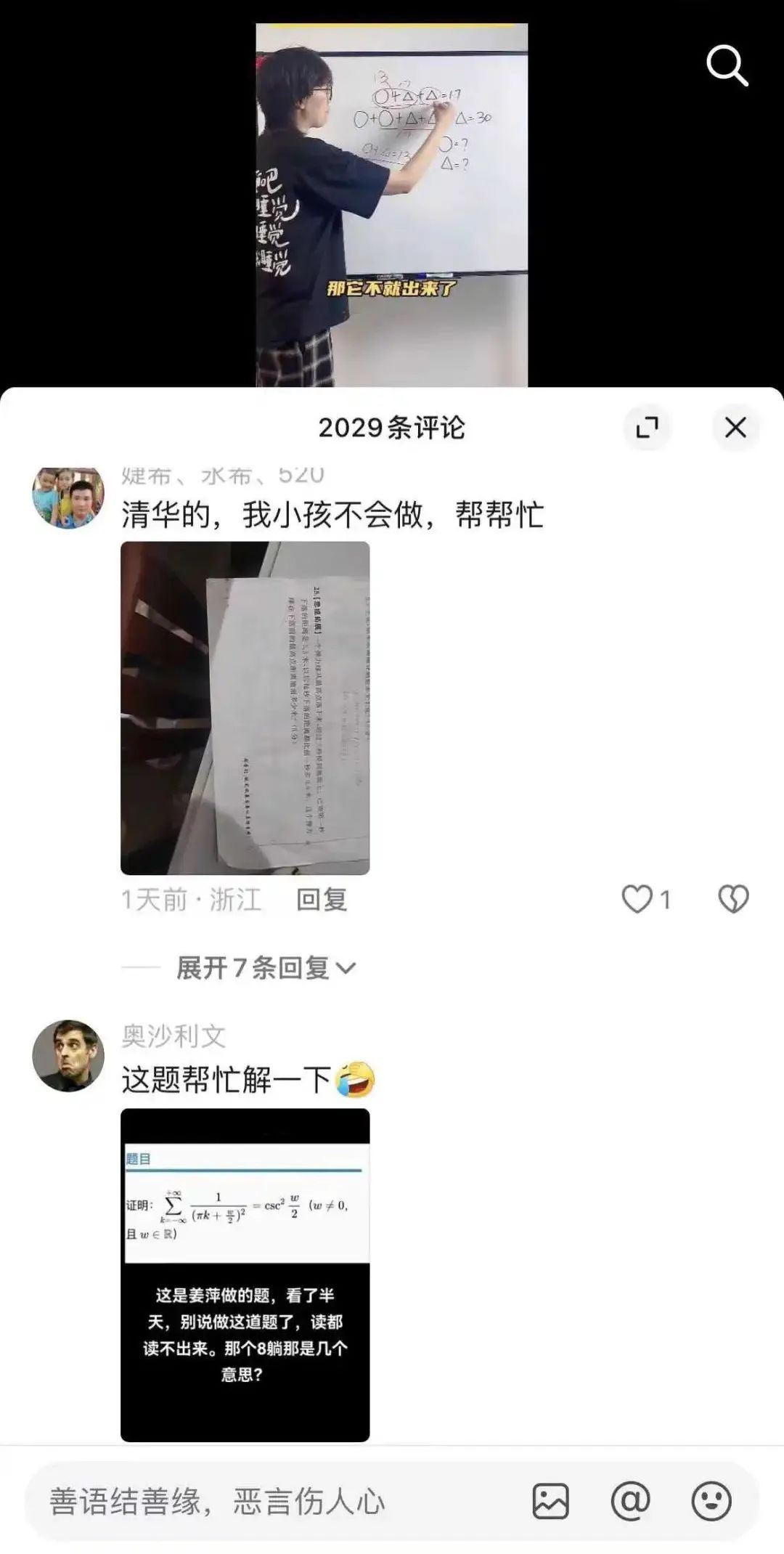 另一个值得注意的点,在于因为博主的亲和的形象,让视频评论区成为了大型家长教育辅导求助现场——大量的家长都直接留言“清华的,这题怎么做”,然后放上小孩习题的截图,求解答。