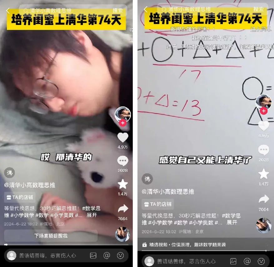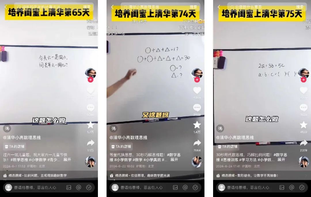 @清华小高数理思维 能破圈一个关键因素就在于他搭建了一个充满挑战的场景——“培养闺蜜上清华”,每条视频都以醒目的字号将“培养闺蜜上清华第X天”放在封面上。