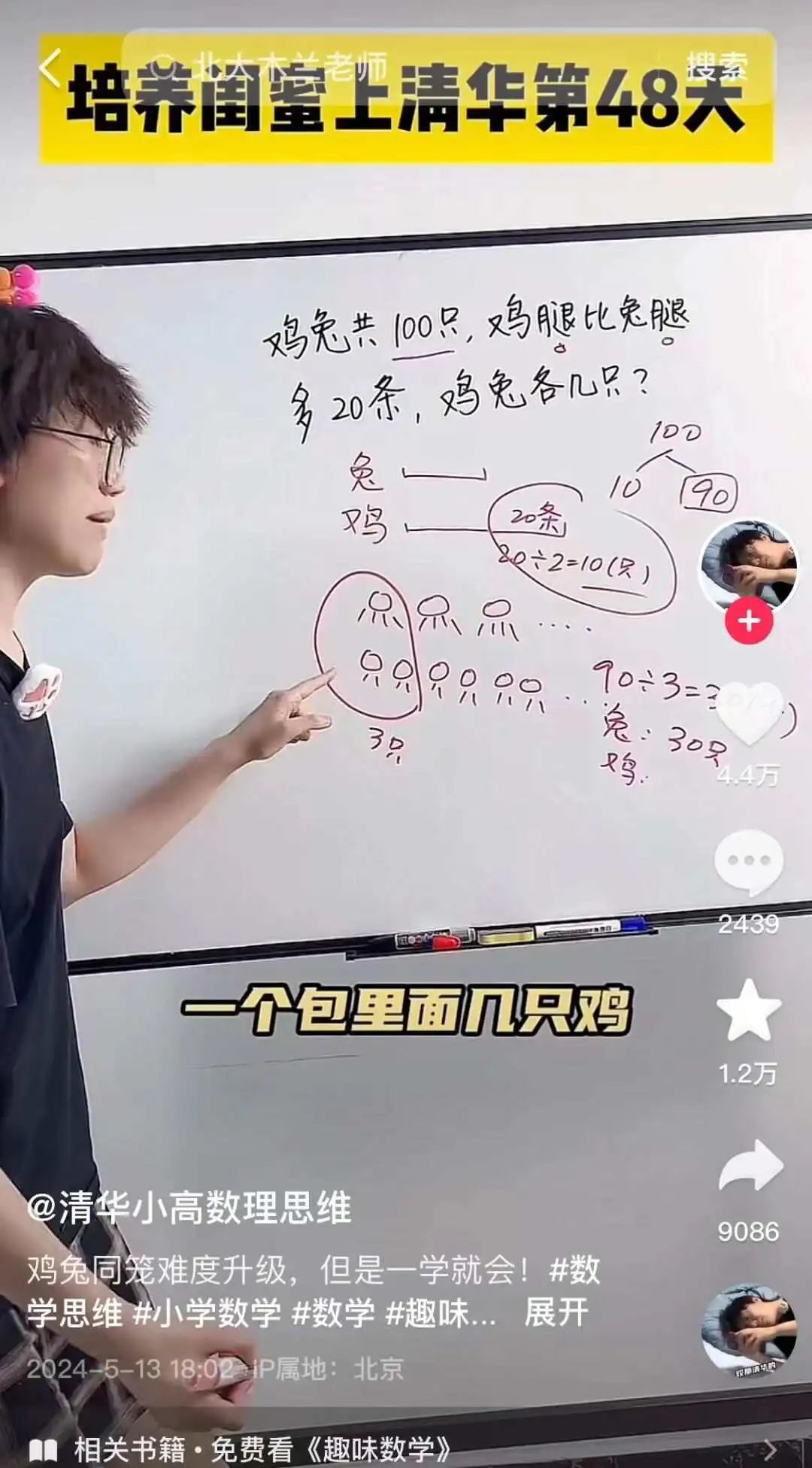 “培养闺蜜上清华”标题唬人,但讲解的都是经典的小学数学问题,其中有期关于「鸡兔同笼」的数学问题,便成功吸引了数百万粉丝来围观她的讲解。