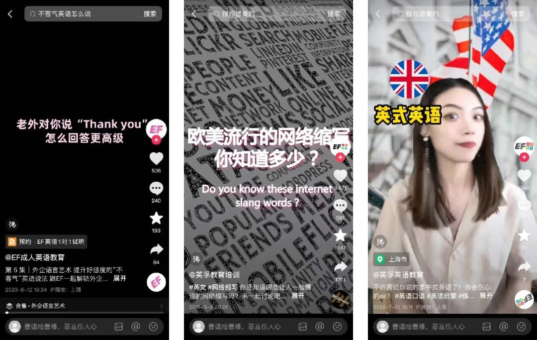EF 成人英语 在抖音上有大量矩阵号,就会用相似的内容结构来在短视频,比如一些现实中的实用英语(说“Thank you”怎么回更高级),或是好玩有趣的英语话题(网络缩写知多少),再用不同的英语老师和拍摄场景来制作内容。