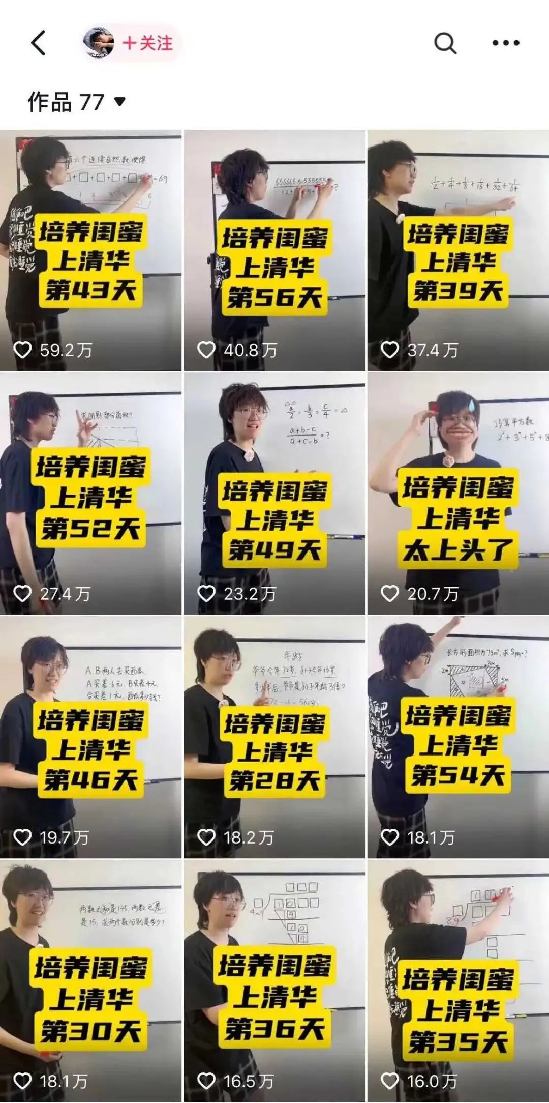 比如最近走红的 @清华小高数理思维 就是个数理学科赛道上特别有意思的博主,该博主目前总共发了 77 条视频,每条封面都打着“培养闺蜜上清华”的标题,最高视频点赞 59.2 万。