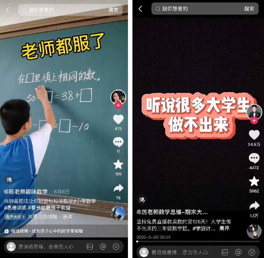 比如 150 万粉丝的 @陈老师趣味数学 爱用“惊讶化场景”,不断复制诸如“校长都服了”、“全班都服了”等视频封面,在视频内容上直接呈现学生解题的过程;而 839 万粉丝的@厉老师数学思维 则爱用反差化法,来制作类似“难倒大学生的数学题”视频封面来吸引家长点击。