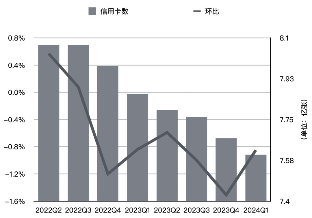 短短两年时间,截至一季度末,全国信用卡和借贷合一卡在用发卡量为7.60亿张,较2022年二季度的8.07亿张减少约4700万张,这也是该指标连续第6个季度环比负增长。(数据来源:《2024年第一季度支付体系运行总体情况》)