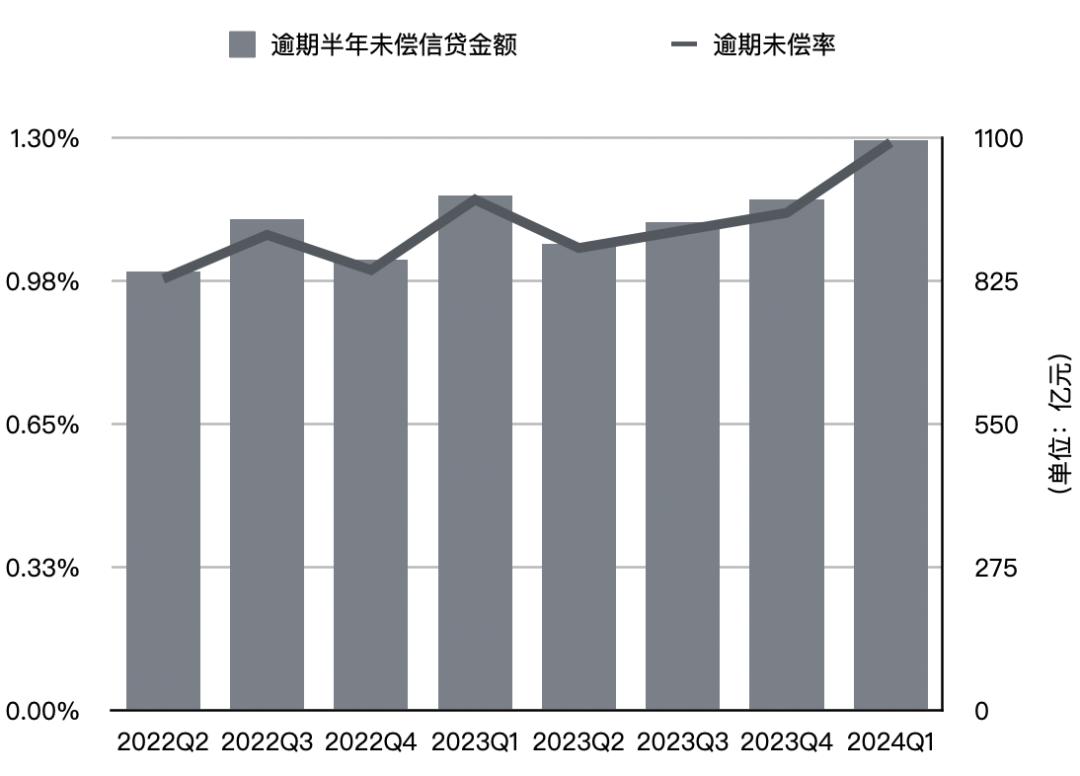 从央行数据来看,虽然过去两年里市场的逾期表现有所起伏,但在今年一季度,相关指标还是双双创下历史的「新高」——逾期半年未偿还信贷总额冲破千亿大关,逼近1100亿元,未偿率达到1.29%,超过疫情期间的「最高水位」。