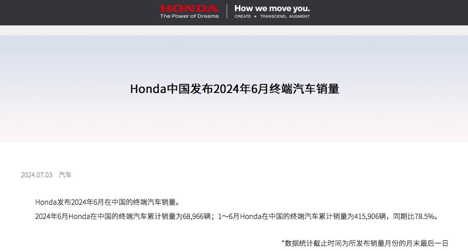 6月份,本田在华销量为 68966辆,同比大跌 39.04%,缩水近4成。1-6月份,本田在华的累计 总销415906辆,同比下降 21.5%。
