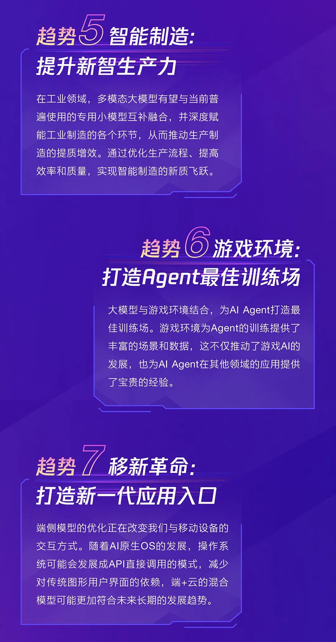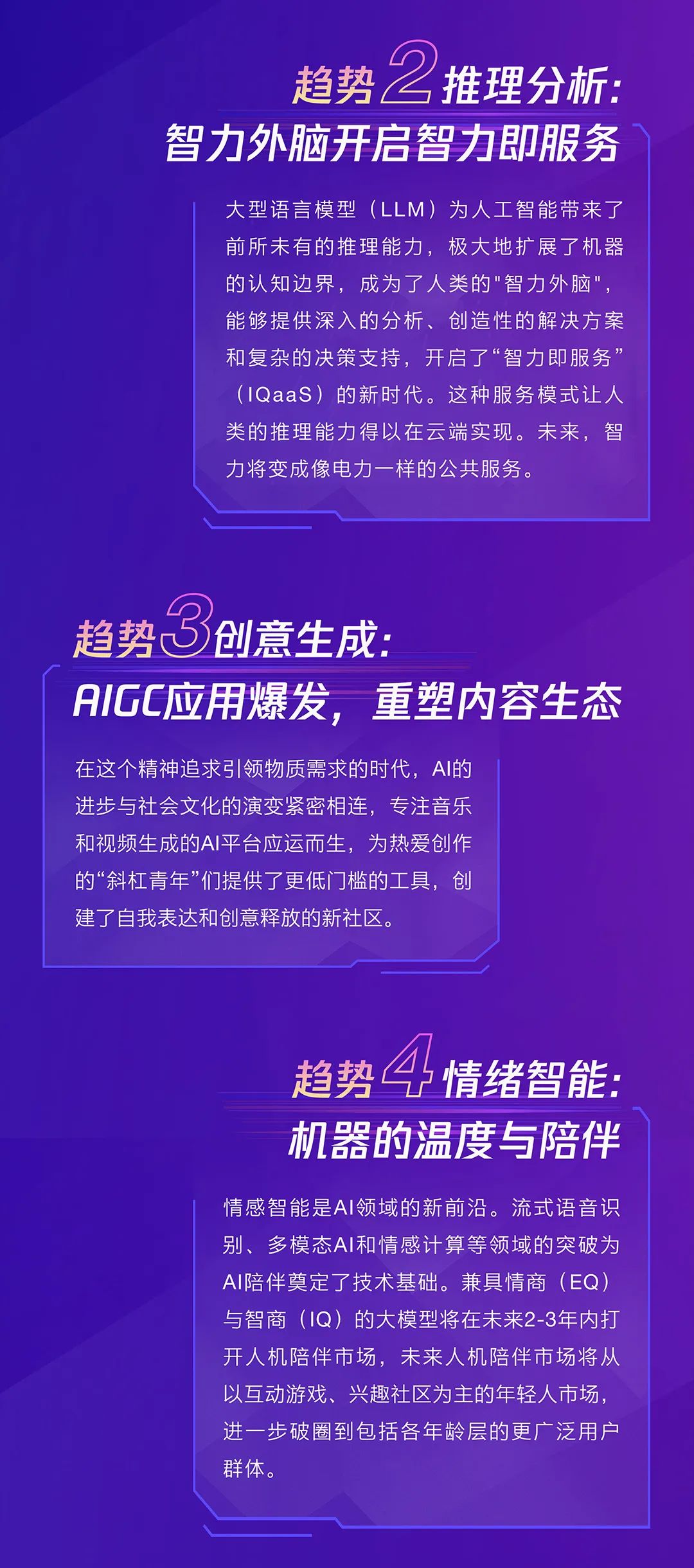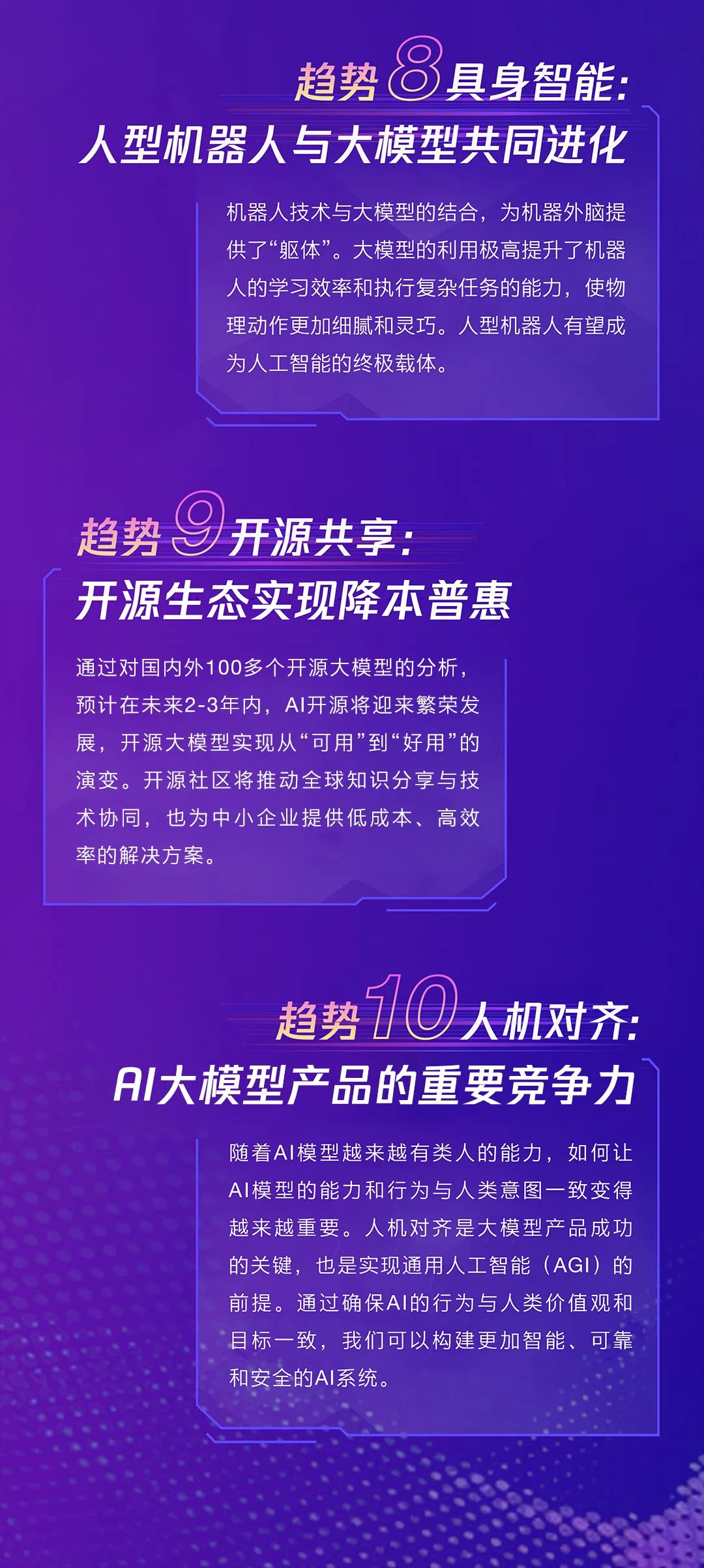 在本报告中,腾讯研究院基于科技行业发展和腾讯自身在AI领域的深耕,提出了10个关键性的趋势,试图理解全世界范围内正在发生的AI巨变。与往年一样,我们从技术、应用、社会三个方面来预测AI给经济社会带来的影响。我们正在进入一个“机器外脑”时代。加速技术为大模型行业的发展提供了算力的保障。随着大模型与人机协作的深入,个体创作的门槛进一步降低,越来越多的个体借助大模型外脑成为“斜杠青年”、“超级生产者”,甚至开启自己的“一人企业”。端侧模型的优化将大幅提升提升移动设备的体验,开启全新的人机交互方式。在工业领域,多模态通用感知技术正在提升生产力,而游戏与大模型的共生关系为Agent训练提供了新的舞台。开源模型的成熟,为技术共享与创新提供了强大的生态支持。最后,人机对齐成为确保大模型安全与治理的核心议题,指引着我们走向一个更加智能、高效和安全的未来。