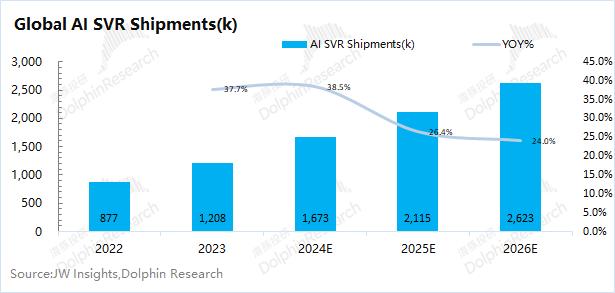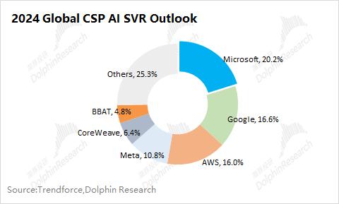 综合数据来看,海豚君认为AI服务器的出货量预期相对合理,出货量同比增长38.5%。随着AI服务器的升级及均价的提升,在资本开支不变的情况下,反而会影响到AI服务器出货量的提升。除非云厂商进一步提升资本开支规模。
