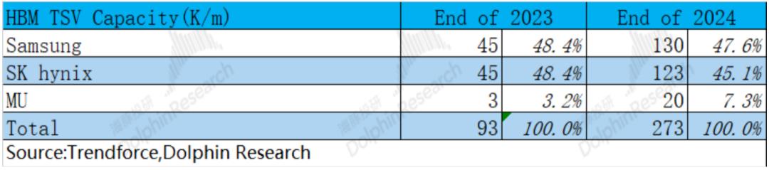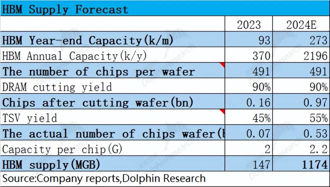 以HBM3/HBM3E(11mm*11mm)为例,单片12寸晶圆大约能切割491颗芯片。依次做如下假定:1)切割效率为90%;2)TSV等良率55%;3)平均单颗粒的容量提升至2.2G左右。海豚君可以测算出,HBM的供给端有望从2023年的147MGB,提升至2024年的1174MGB,是去年同期的接近8倍。如此大的提升,主要得益于大规模的产能扩张、TSV良率的提升和单颗粒的容量增加。