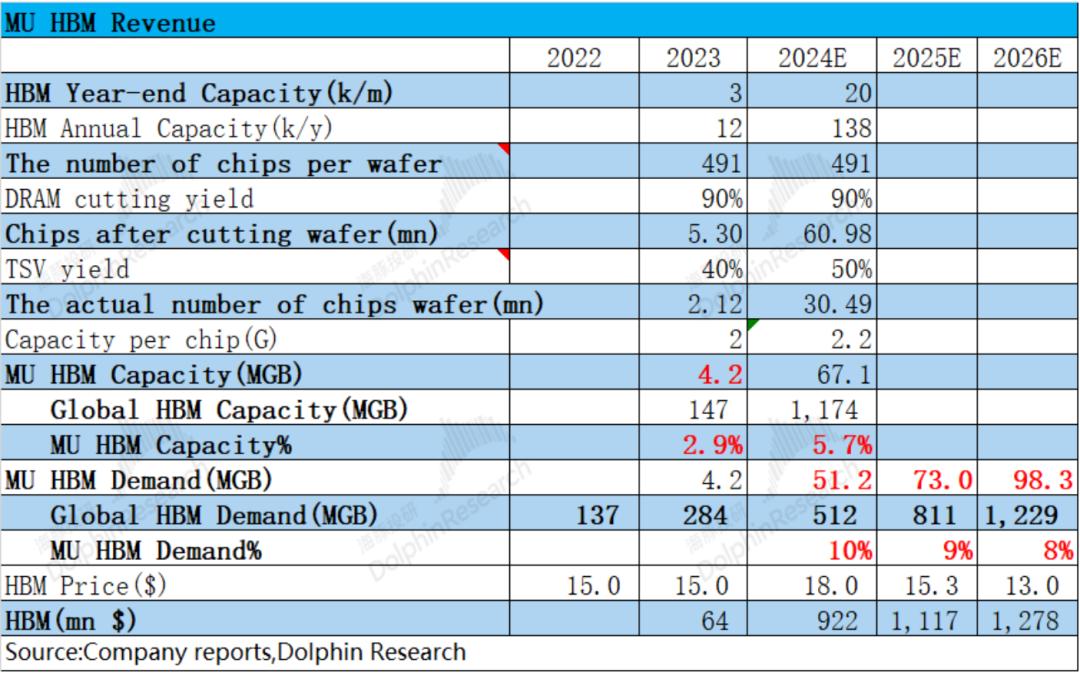 通过前期对HBM供需关系的分析,在供不应求的时候,供给端的产能是主要因素。而当供大于求时,主要根据需求端的数据来测算。因此2023年美光HBM的收入从产能角度来算,而2024年起从需求及市场份额来算。