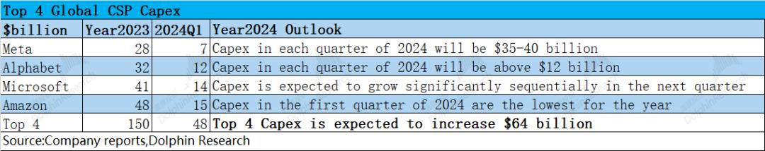 在GPT等需求的带动下,主流云厂商纷纷都提升了自身的资本开支。2023年四大云厂商(Meta、谷歌、微软和亚马逊)的资本开支总计1500亿美元。结合一季度各公司管理层交流情况,四家公司的资本开支在今年都有望提升,海豚君预期4家公司的合计资本开支有望提升640亿美元,同比增加42%。