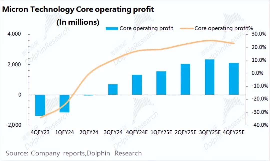3)整体来看:叠加传统产品和HBM的两方面情况,海豚君预期美光在2024财年的核心经营利润在10亿美元左右;而2025财年的核心经营利润有望提升至80亿美元以上。由于2024财年(即24Q3)很快结束,市场对公司主要关注于本财年后的业绩表现。而当前股价对应2025财年的估值仍有18倍PE左右。