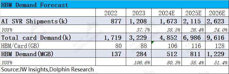 ①需求端:结合云服务厂商的资本开支和AI出货量情况,市场对HBM的需求有望从2023年的284MGB提升至512MGB;