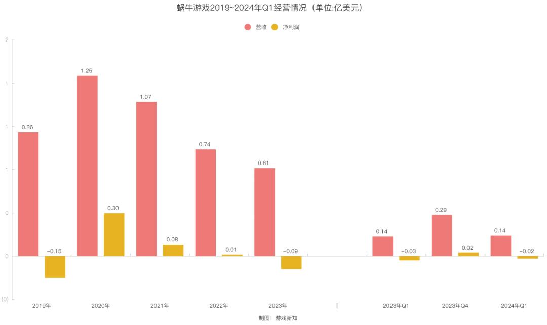 今年5月,蜗牛游戏发布Q1财报,其中营收为1412万美元,环比下降106%,净利润则为-180万美元。再看前面几年的业绩,公司的营收自2021年就持续下滑,去年更是由盈转亏,亏损来到910万美元(约合人民币6610万)。