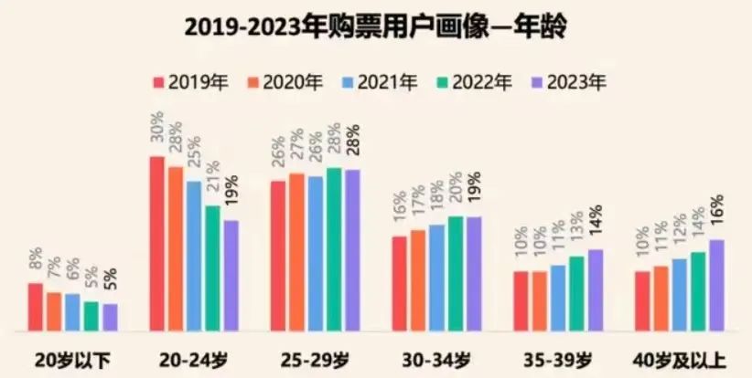 据灯塔专业版数据显示,40岁以上购票观众占比从2019年的10%增长到2023年的16%,25-39岁观众有增有降,表现平稳,年轻观众占比却在逐年下降。2019年,20-24岁观众占比还为30%,但到2023年,20-24岁观众占比仅为19%,与此同时,20岁以下观众从2019年的8%降低逐年走低至2023年的5%。